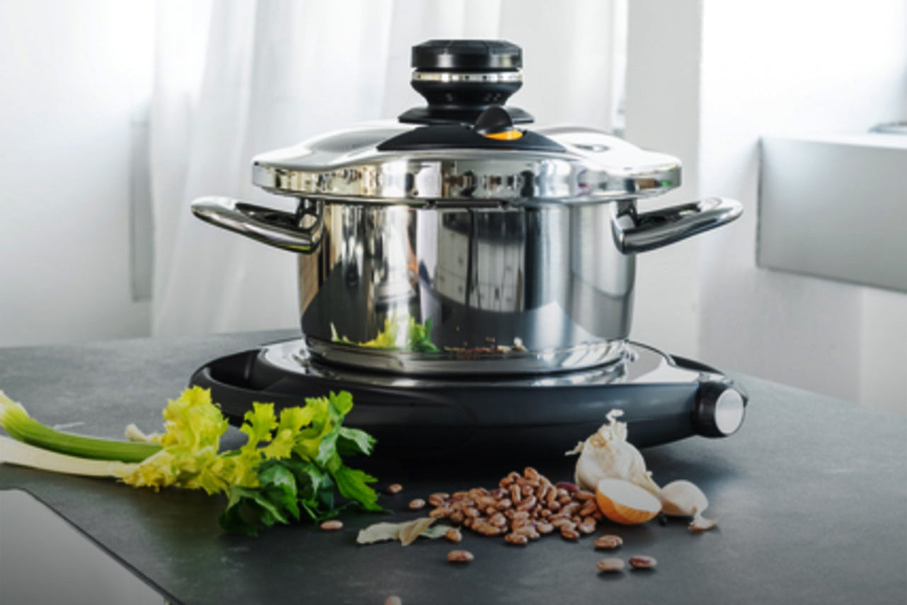 Desfrute de um guisado tenro em tempo recorde! Com a tampa rápida AMC e a placa de cozinha móvel Navigenio.