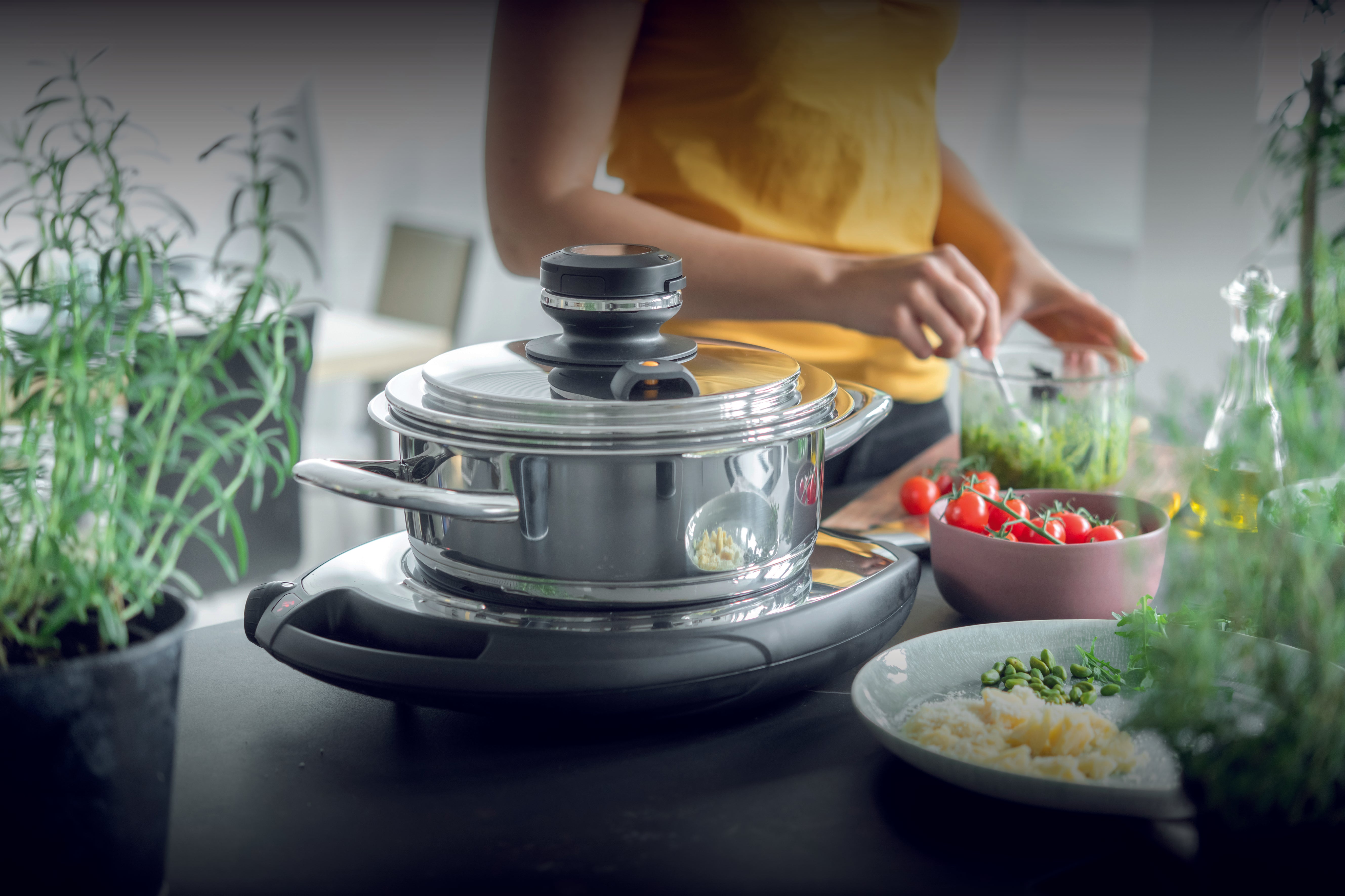Torna-se assim possível cozinhar sem adicionar água: a base absorve rapidamente o calor, armazena-o de forma eficiente e distribui-o uniformemente pelos alimentos. Durante a cozedura, forma-se um ciclo fechado entre a base da panela, o rebordo de arrefecimento e a tampa, o que impede a fuga de vapor e garante que os alimentos cozinhem no seu próprio suco. Isto preserva os nutrientes e o sabor natural dos pratos.